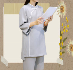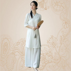 Bộ quần áo đi lễ chùa, áo lam đi chùa, trang phục đi chùa nữ, vải đũi, cổ cao 3 nút, tà dài, màu trắng, nâu, ghi, lam, size S M L XL 2 XL hàng cao cấp, may theo yêu cầu - An Thanh Tú