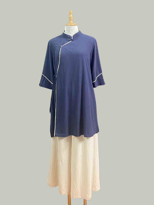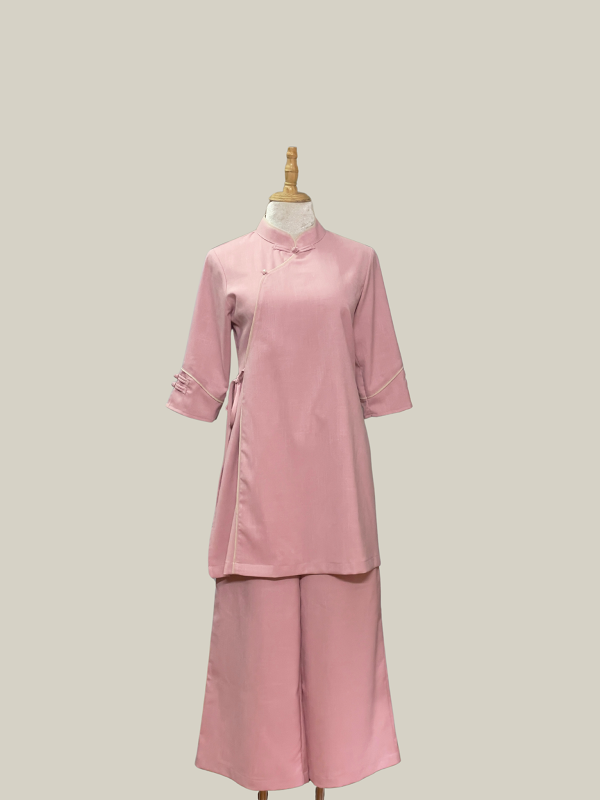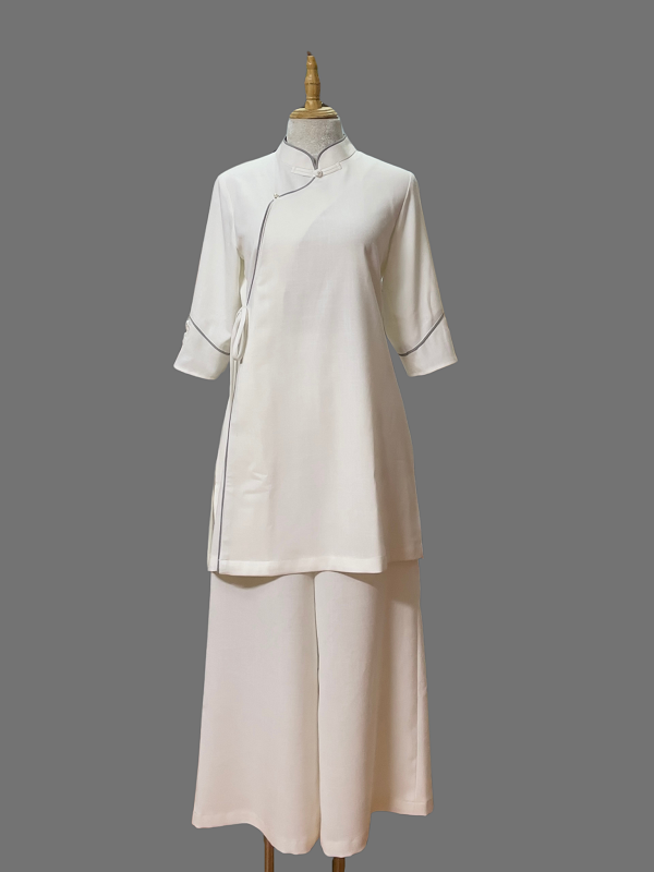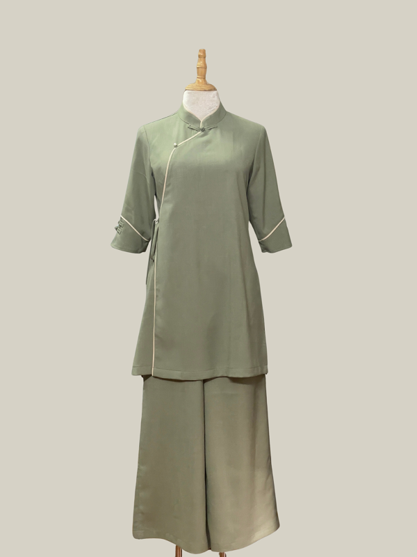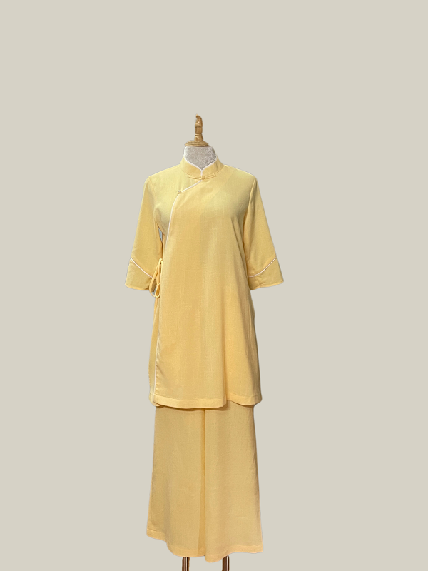 Phối cùng chiếc áo là quần ống rộng màu be lửng, mang lại cảm giác thoải mái, nhẹ nhàng và dễ di chuyển. Đây là lựa chọn lý tưởng cho những buổi thiền, dạo chơi vườn thiền, hoặc đơn giản là khi bạn cần một không gian nội tâm tĩnh lặng giữa cuộc sống tất bật.