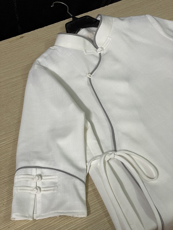 Áo dài tay màu than trầm được cách điệu tinh tế với phom suông nhẹ, cổ tàu (Mandarin collar) và đường nẹp vát chéo duyên dáng. Từng nút vải thủ công được bọc và đính tỉ mỉ, thể hiện sự trân trọng từng chi tiết nhỏ nhất.