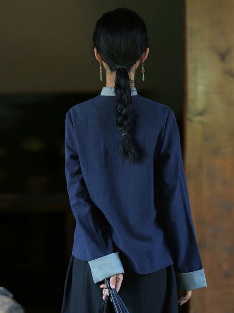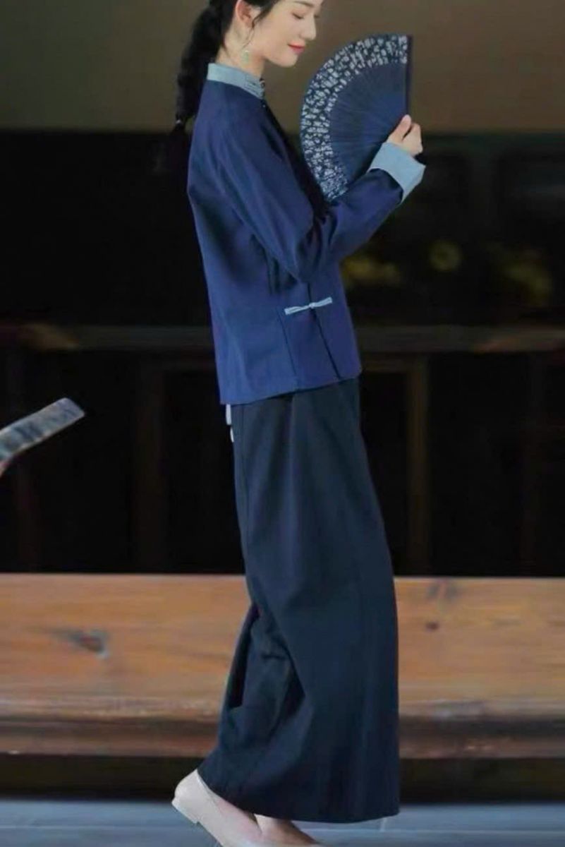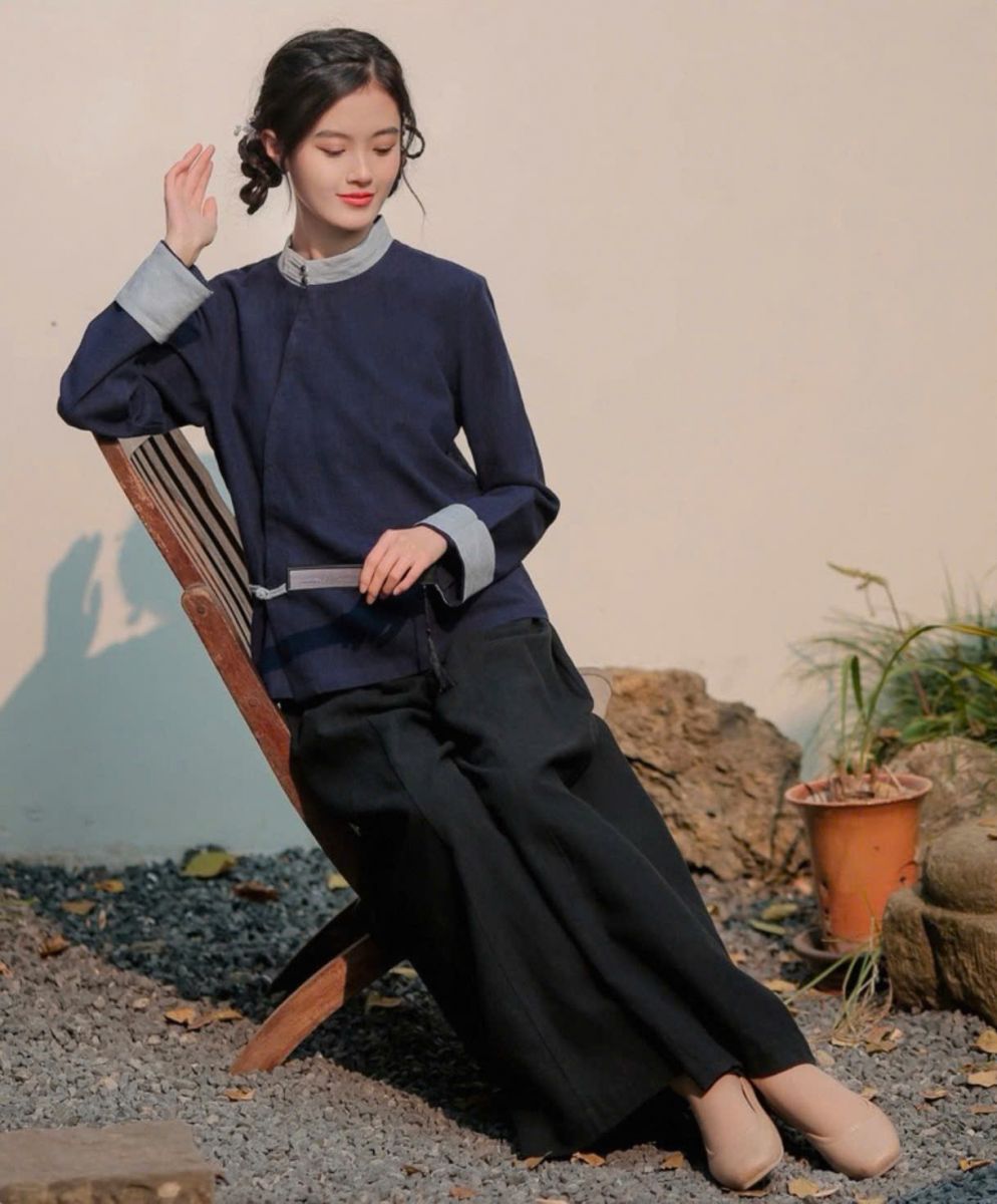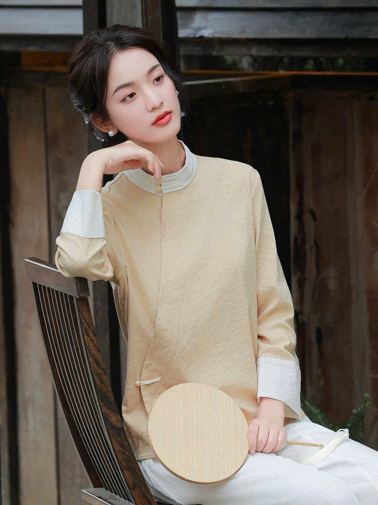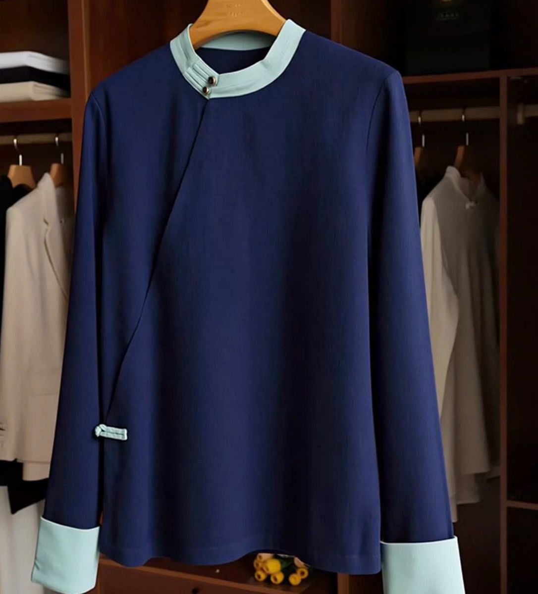 Áo được thiết kế cổ tàu truyền thống, tay dài rộng nhẹ tạo cảm giác thoải mái khi di chuyển, lễ Phật hoặc ngồi thiền. Điểm nhấn tinh tế nằm ở đai thắt nhẹ ngang eo, giúp form áo gọn gàng và thanh lịch hơn.