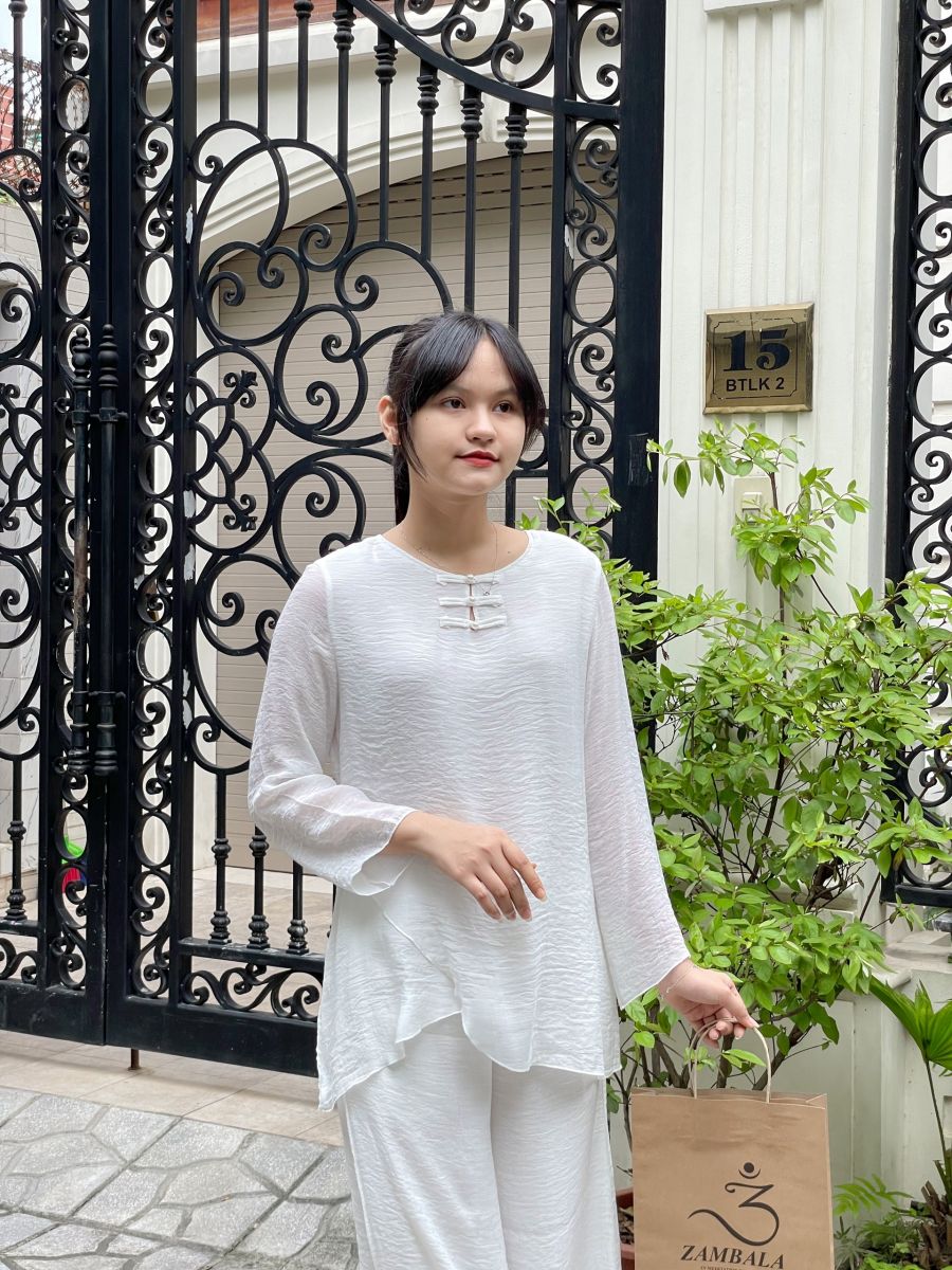 Bộ Tâm Đan Sương - chất liệu vải vải cắt may tay thủ công từng bộ bằng vải tơ đũi mềm mại nên rất dễ chịu và thân thiện với môi trường, được may 2 lớp vải nên nhìn kín đáo, được cắt may cần thận từng đường kim mũi chỉ