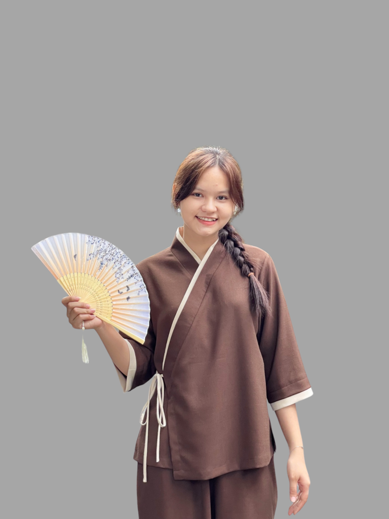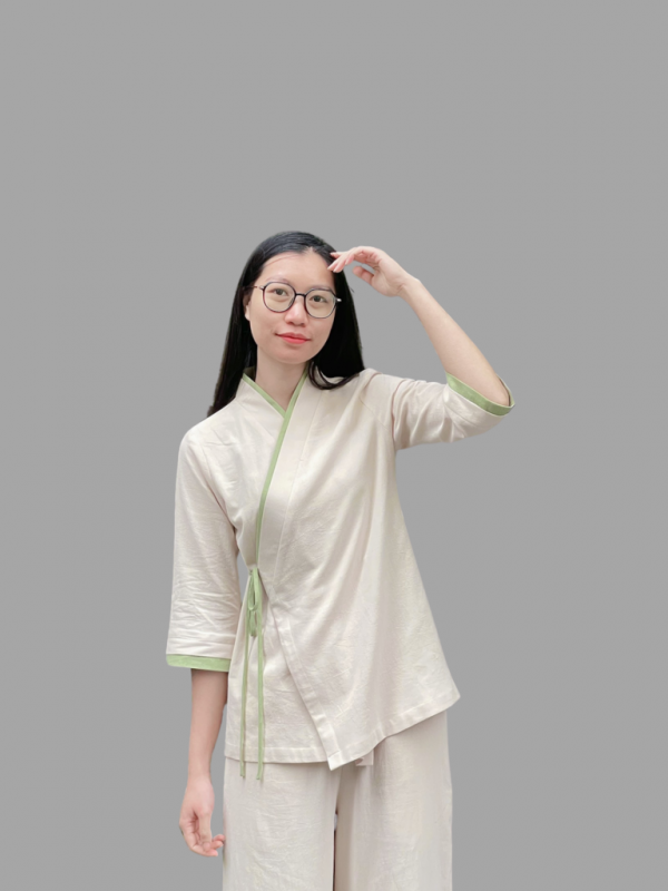 Áo được thiết kế với cổ cài chéo, viền và dây buộc cố định hai bên, giúp form áo đứng dáng và thoải mái khi vận động. Chất liệu vải thoáng khí, phù hợp mặc hằng ngày hoặc trong không gian thiền – trà đạo.