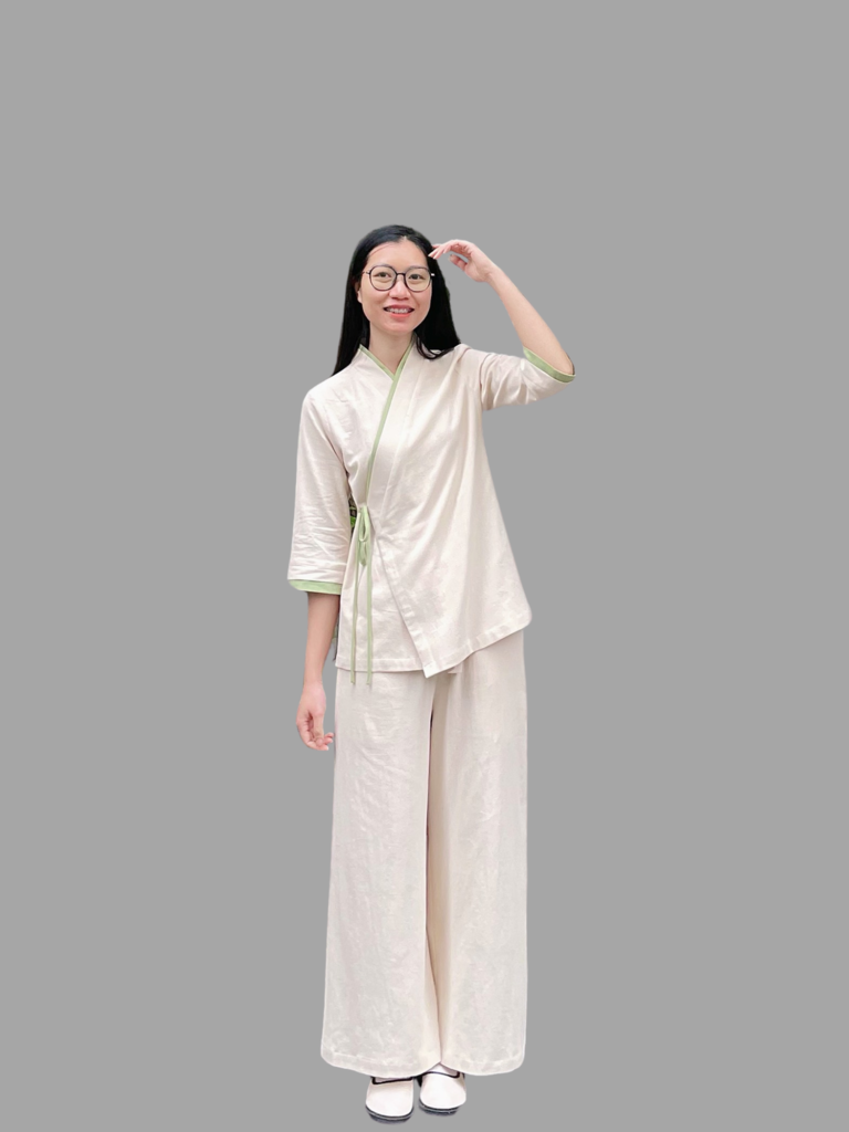 Quần ống rộng giúp tôn dáng và mang lại cảm giác thoải mái, dễ phối với nhiều trang phục khác. Bộ quần áo có tông màu tự nhiên, mang vẻ mộc mạc, nhã nhặn, rất thích hợp cho người yêu thích phong cách truyền thống, tối giản, hoặc muốn tìm một outfit thư giãn, mang hơi hướng thiền định.