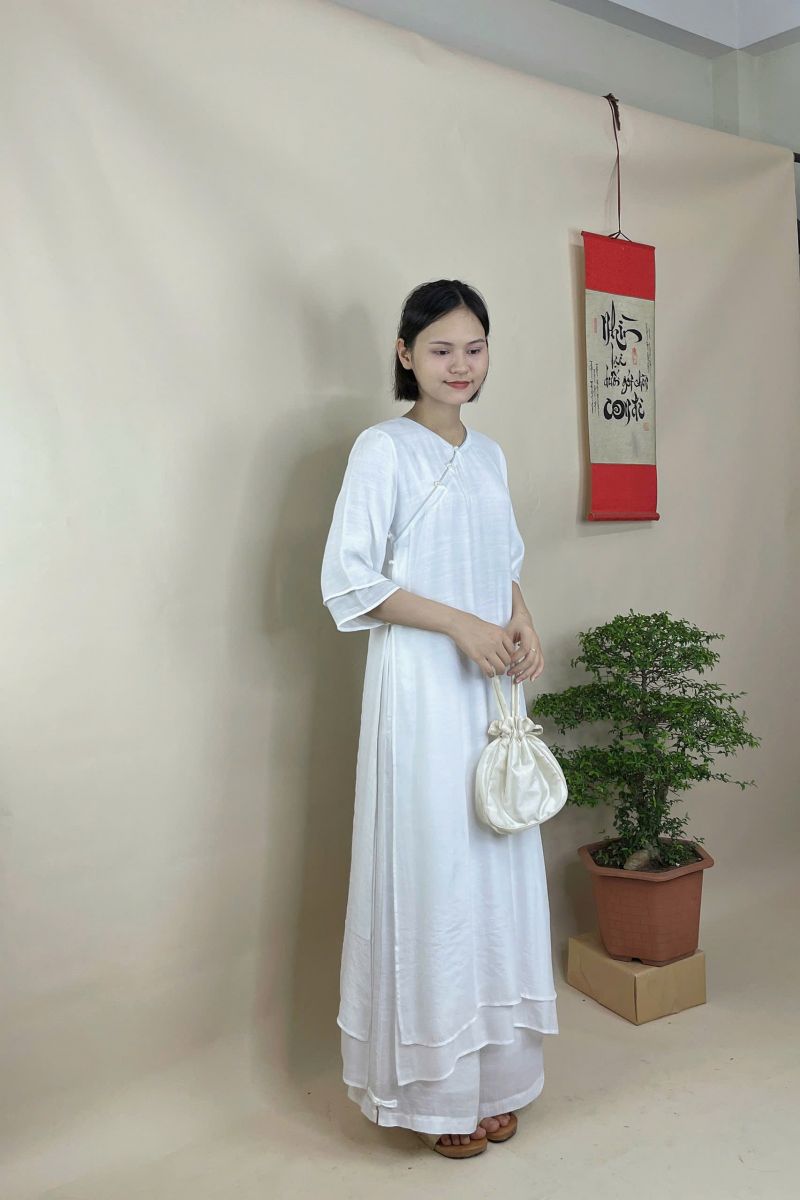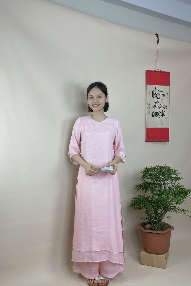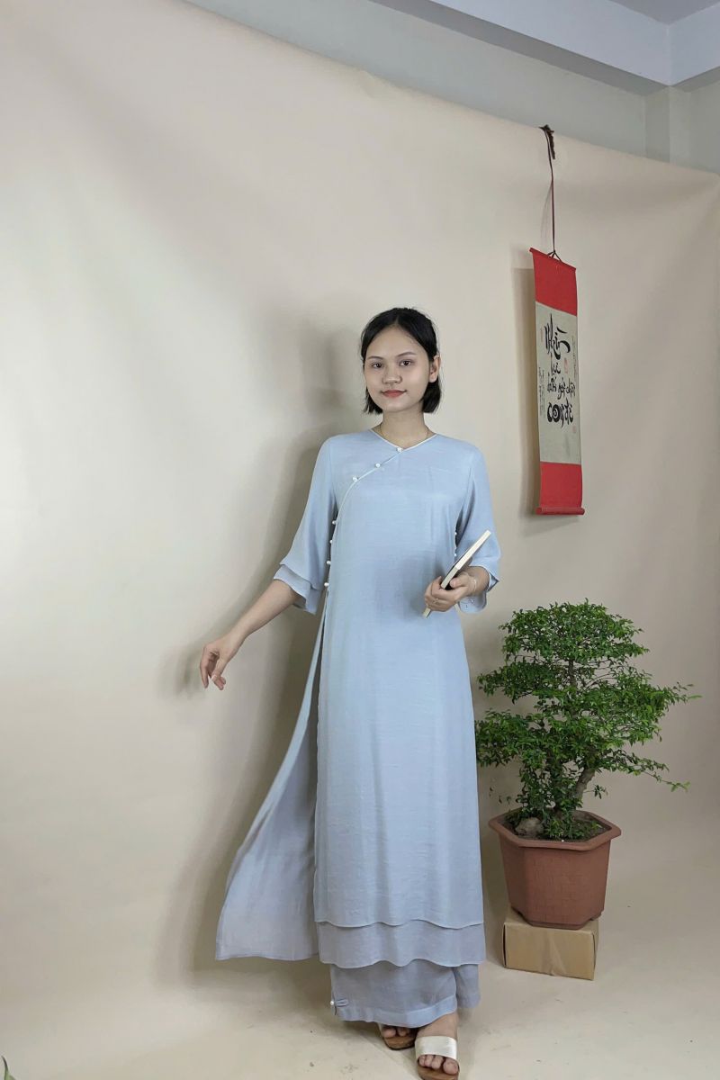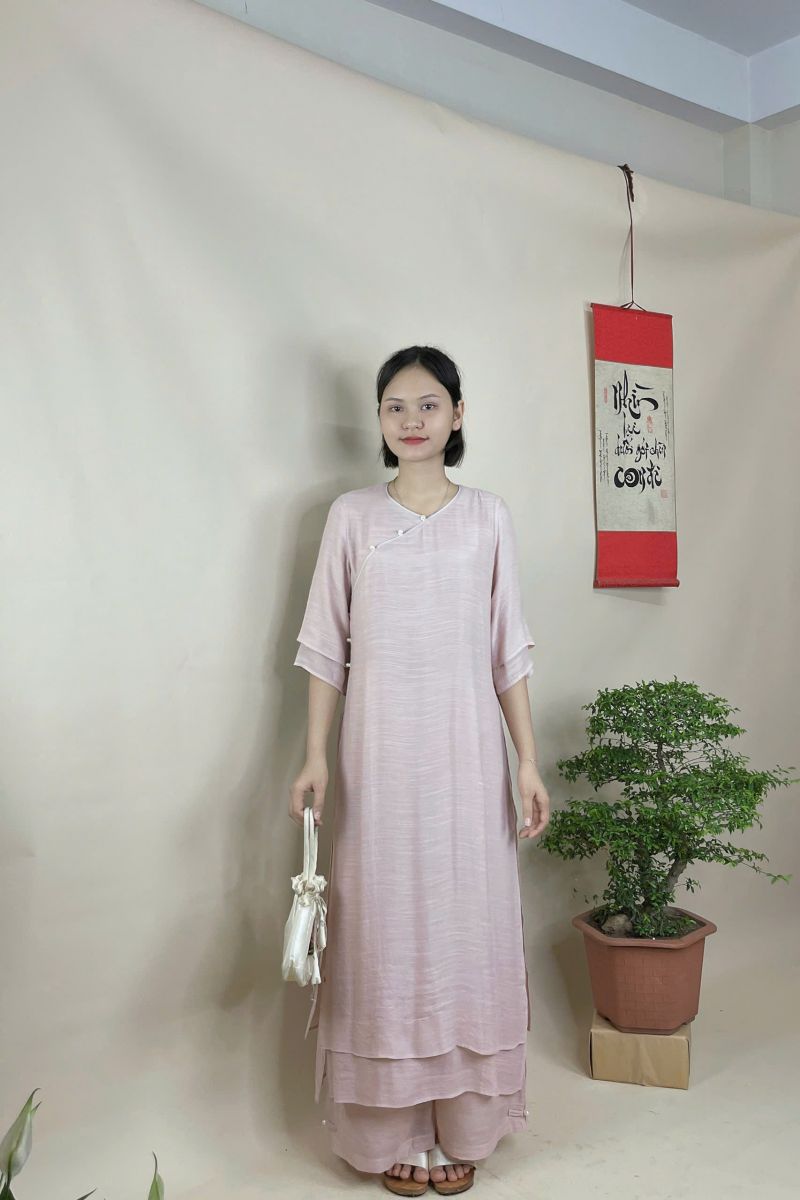 Bộ Tiên Cô Hạ Sơn - chất liệu vải vải cắt may tay thủ công từng bộ bằng vải tơ đũi mềm mại nên rất dễ chịu và thân thiện với môi trường, được may 2 lớp vải nên nhìn kín đáo, được cắt may cần thận từng đường kim mũi chỉ