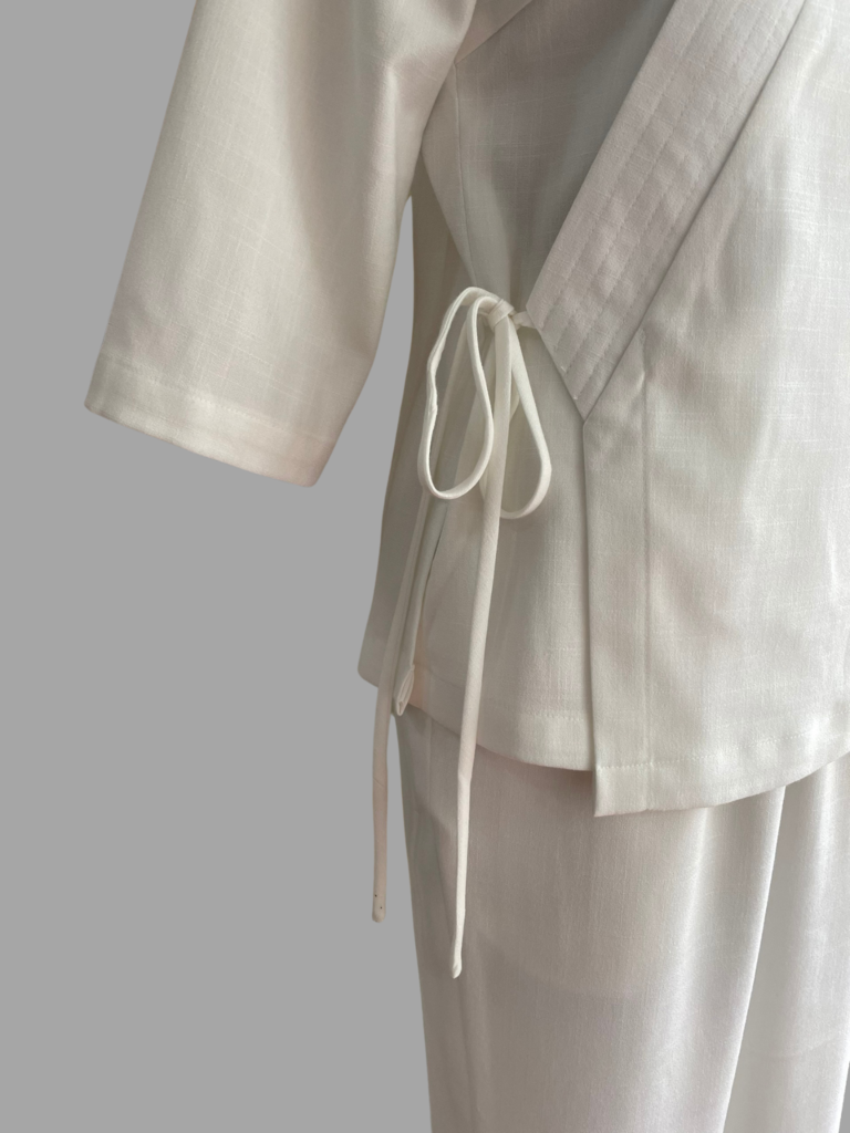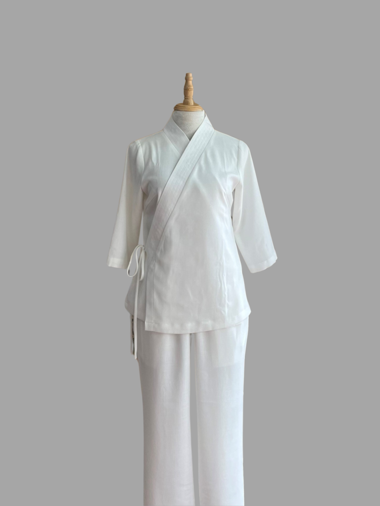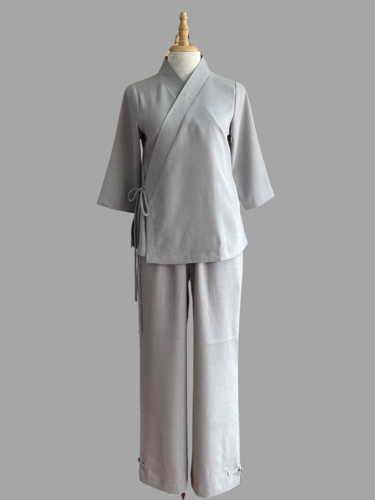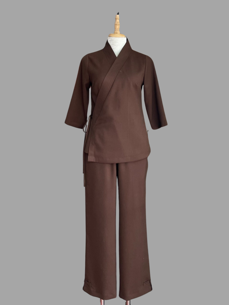 Bộ Đan Thiên nữ - chất liệu vải vải thô Cara hoặc thô đũi Linen thuộc một trong những loại vải có tính bền và thân thiện với môi trường. Ưu điểm chính phải kể đến chính là tính an toàn (không gây kích ứng da) và khả năng thấm hút mồ hôi quá tuyệt vời của vải thô. Với thành phần chủ yếu là sợi bông và sợi gai (đay), vải thô có thể nói là loại vải nhẹ nhàng nhất, thích hợp nhất dành cho các mùa và dành cho người tu thiền, tập dưỡng sinh yoga
