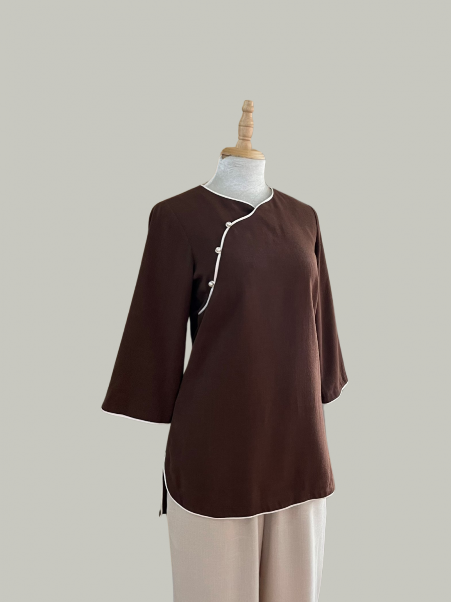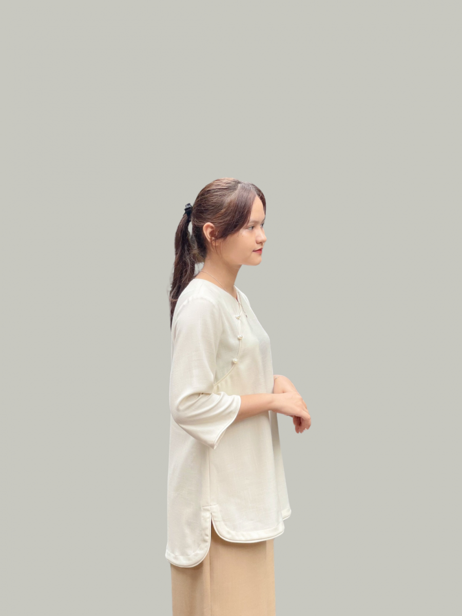 Cổ lệch cách điệu điểm khuy thủ công tạo nét duyên nhẹ nhàng, kín đáo.