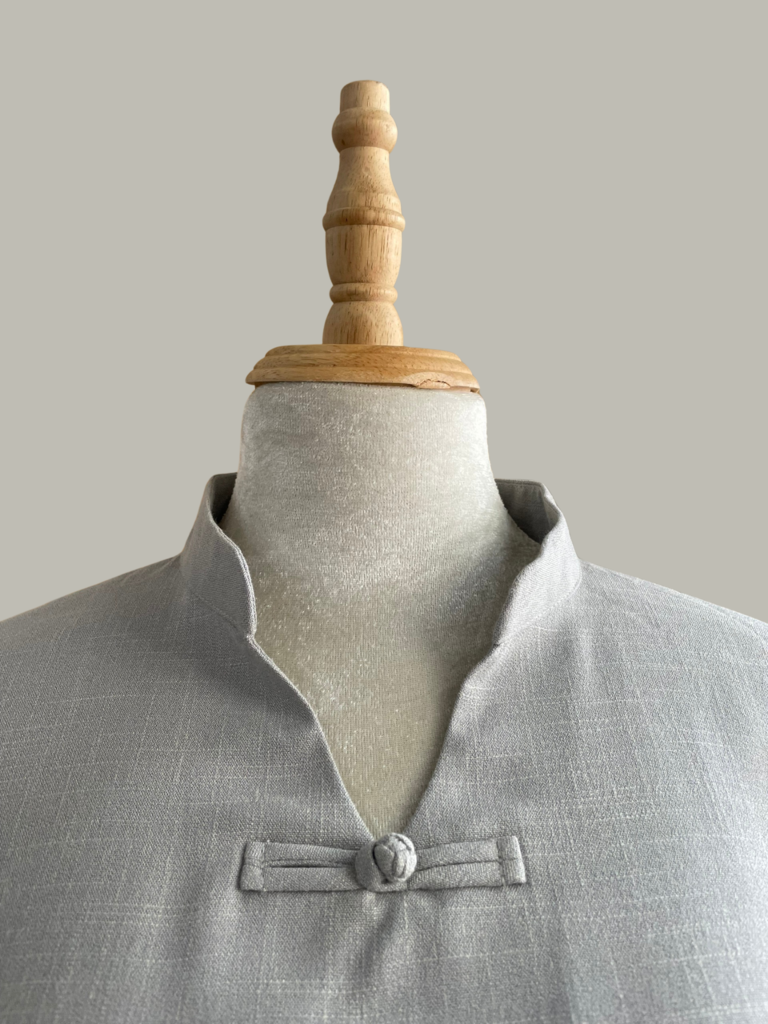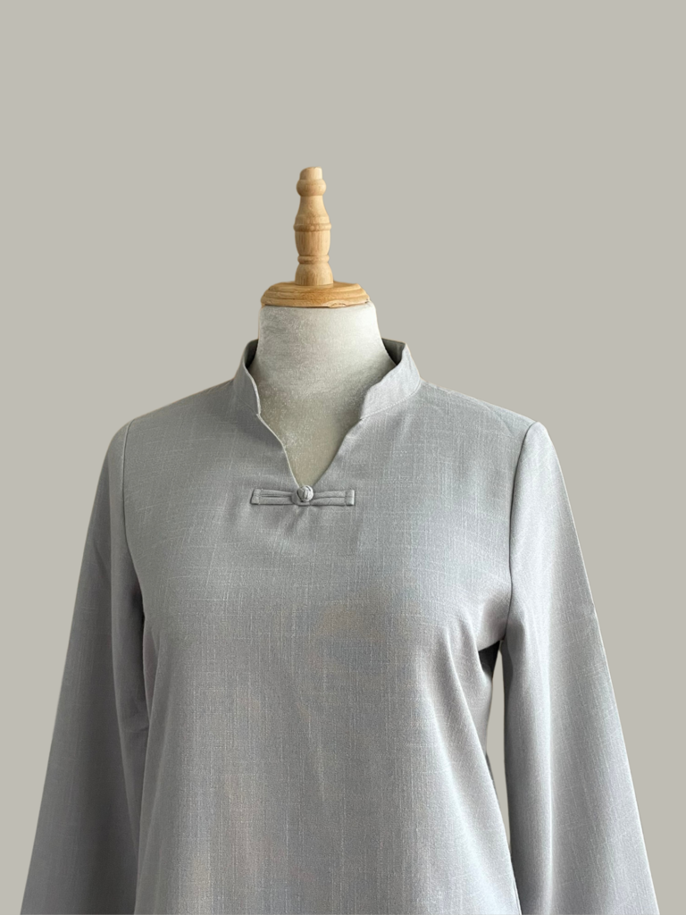Trang phục ZAMBALA có cổ áo được thiết kế cổ đứng chữ V, thêm nút thắt cài bằng vải, đưa vào thiết kế mẫu này tạo cảm giác thánh thoát và nữ tính hơn.